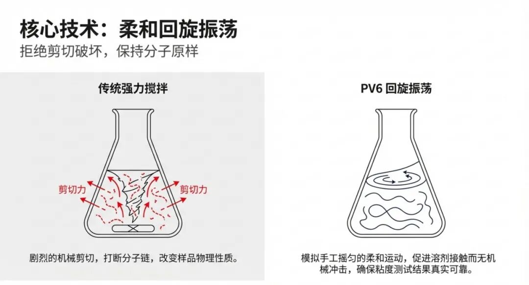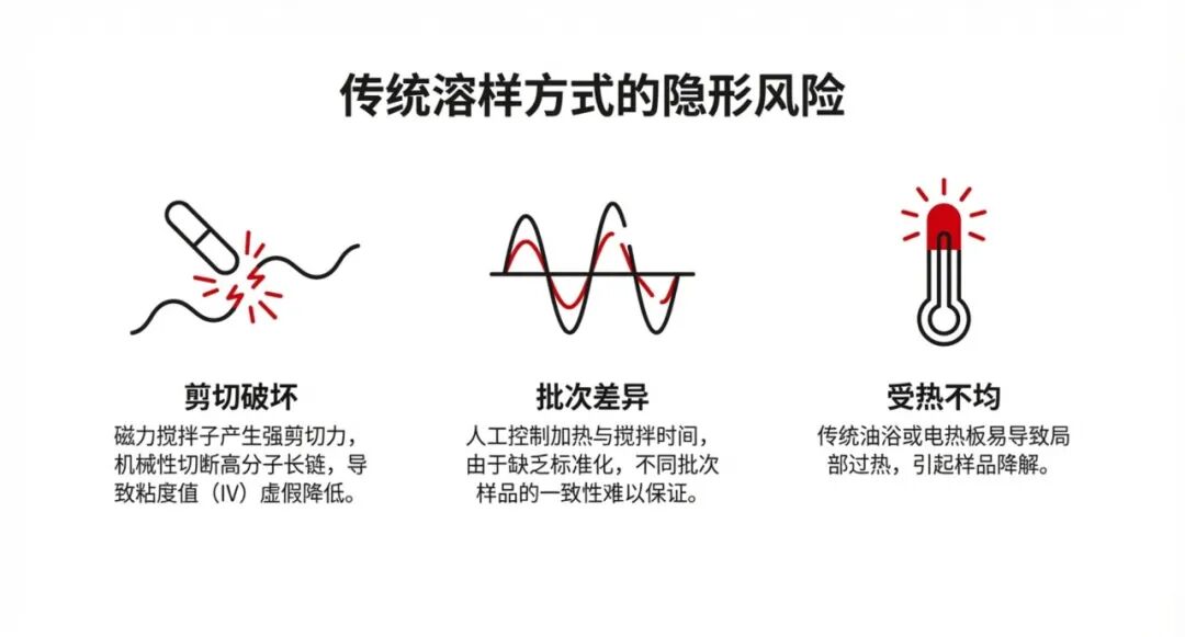 PV6 不參與分析計(jì)算,但在分析測(cè)試之前,為樣品提供穩(wěn)定、均一的溶液狀態(tài)。傳統(tǒng)溶樣方式中,常見的現(xiàn)實(shí)問題在常規(guī)溶樣過程中,樣品往往通過強(qiáng)力攪拌或簡(jiǎn)單加熱來完成溶解:- 溶解過程對(duì)大分子結(jié)構(gòu)干擾較大